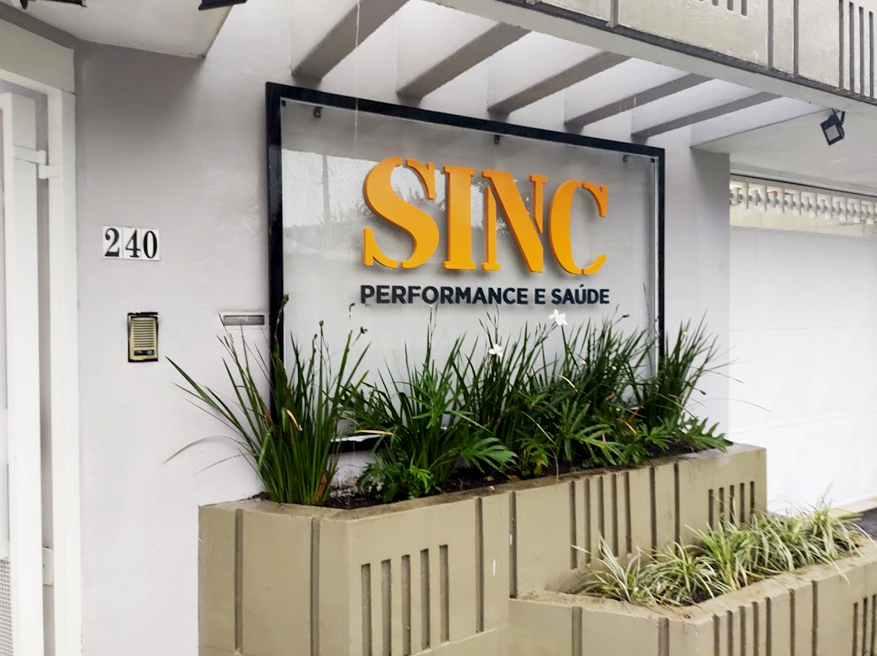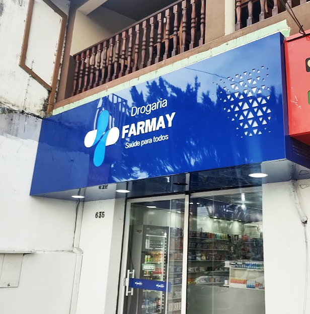 Fachada em ACM com logo vazado com iluiminação interna, corte especial para saída de ar para o ar-condicionado.